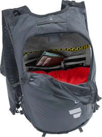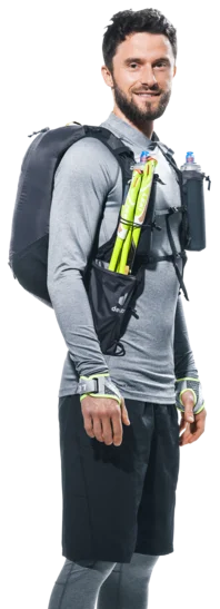 Ultra-lightweight and super comfortable: wide, ergonomic vest-style shoulder straps with elasticated compression system, two adjustable sternum straps and soft material against the back create a garment-like fit. A stretch mesh inner pocket and side compression straps help eliminate load wobble no matter how challenging the terrain. A holster pocket on the front of one shoulder strap makes it quick and easy to access collapsible trekking poles. And there is space for soft flasks and a GPS in the shoulder strap pockets. The body fabric is made from 100% recycled materials and is bluesign® certified.