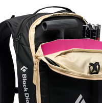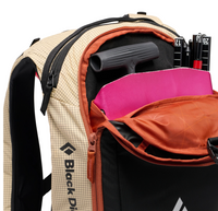The separate snow safety pocket stores your avalanche safety kit, and an oversized insulated shoulder pocket holds a hydration tube, soft flask, or radio. The pack’s form-fitting suspension provides a contoured, body-hugging fit, while the main zippered panel opens for quick access to your gear. Exterior attachment points for skis, snowboard, helmet, and piolet accommodate the needs of skiers and riders.