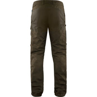 Durable trekking trousers with technical features, made from wind- and water-resistant G-1000. The model is based on our best-selling Vidda Pro but has improved ventilation options and a slimmer fit with stretch fabric in crotch so still has great freedom of movement . The buttoned strap adjustments at the leg endings can be removed and there are numerous practical pockets and details – such as a knife pocket on the right leg and a loop for an axe on the side of the waist.